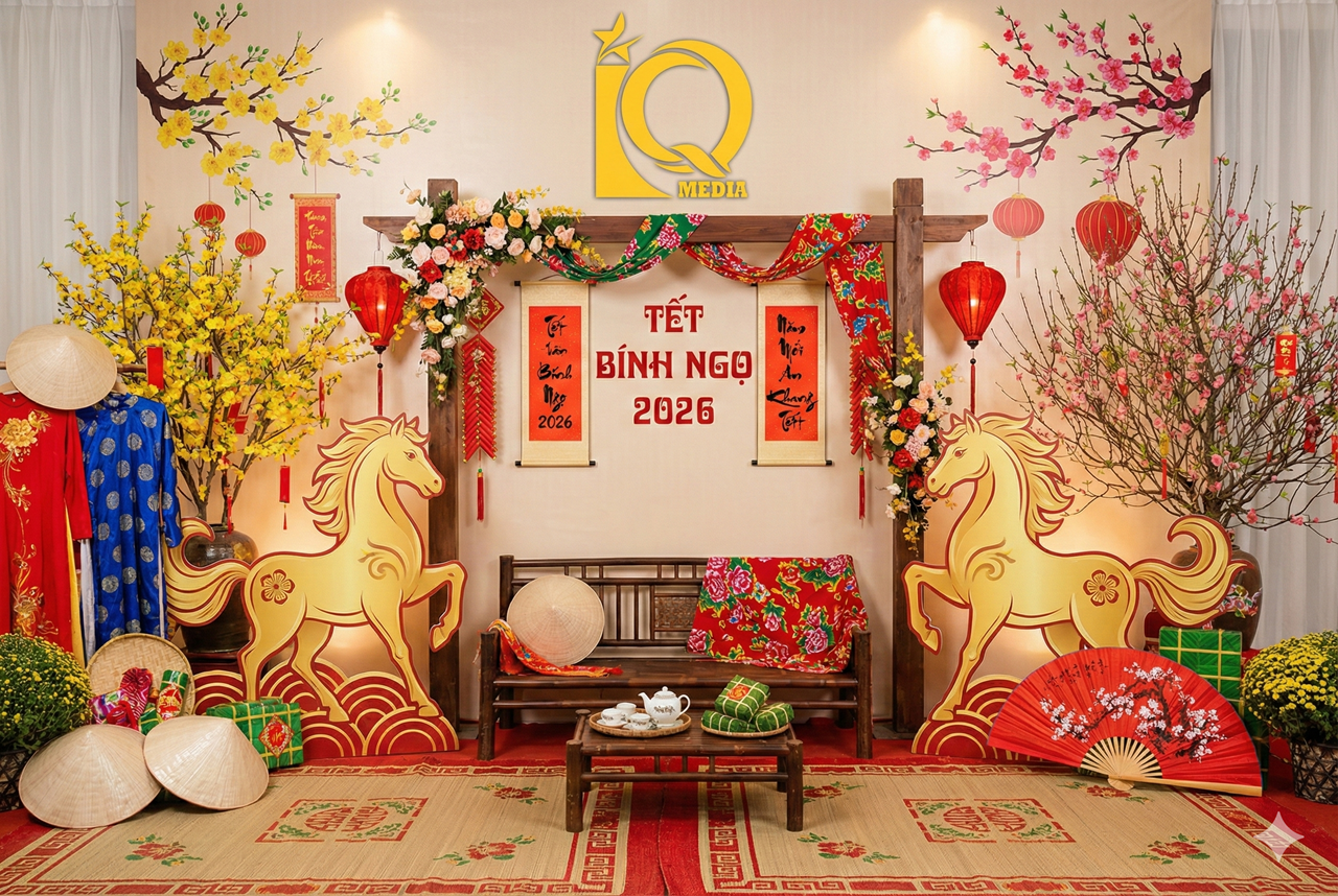 Photobooth Tết không đơn thuần là một phông nền chụp ảnh. Đó là sự kết hợp hài hòa giữa màu sắc, ánh sáng và các chi tiết mang tinh thần xuân như hoa mai, hoa đào, câu đối đỏ, linh vật năm Ngọ, quạt giấy, lồng đèn… Tất cả tạo nên một không gian vừa quen thuộc, vừa mới mẻ, phù hợp với không khí Tết Bính Ngọ 2026.